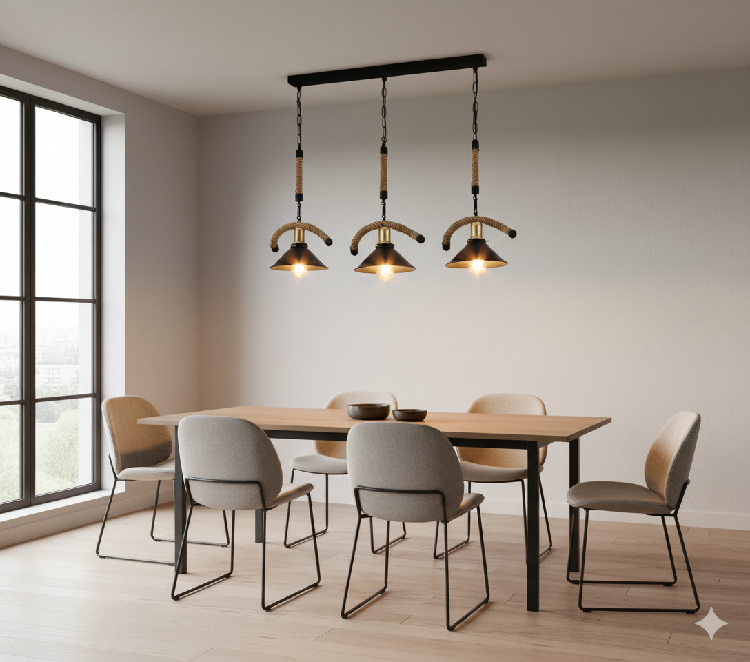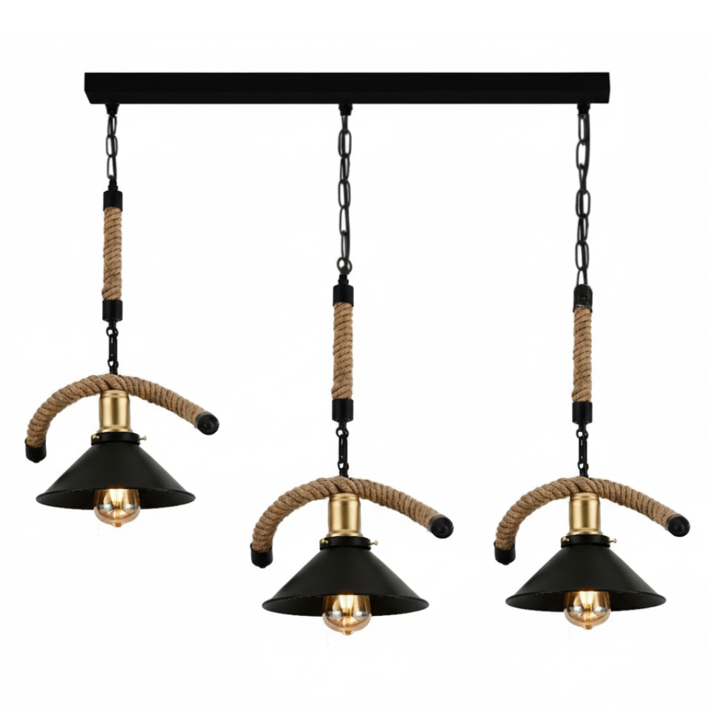 Stylish 3-head linear pendant with rope-wrapped arms, gold bulb holders and adjustable-height black cone shades.