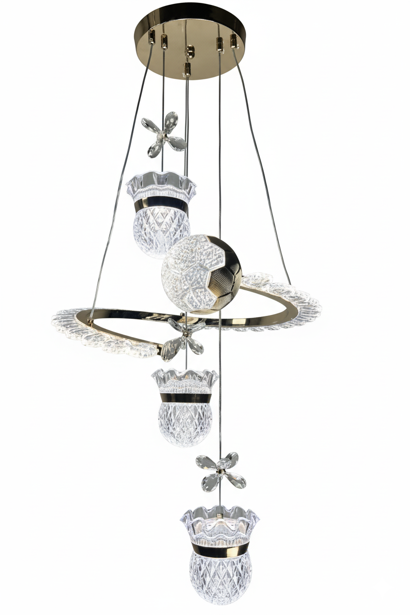 Breathtaking multi-tier LED crystal pendant with flower canopy ceiling plate and cascading crystal shades. Remote control dimming for ambiance control.