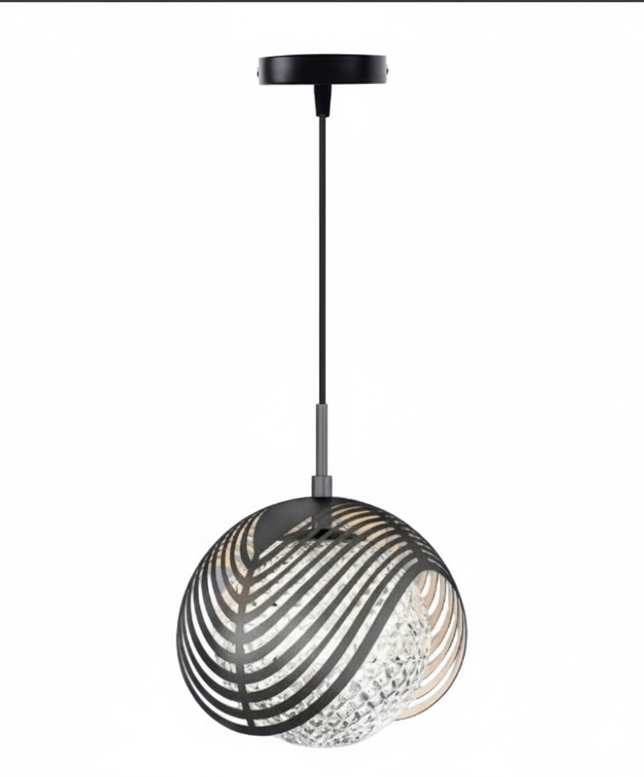 Sleek black spherical cage pendant featuring a faceted crystal glass inner globe. Stunning contrast of matte black metal and sparkling crystal.