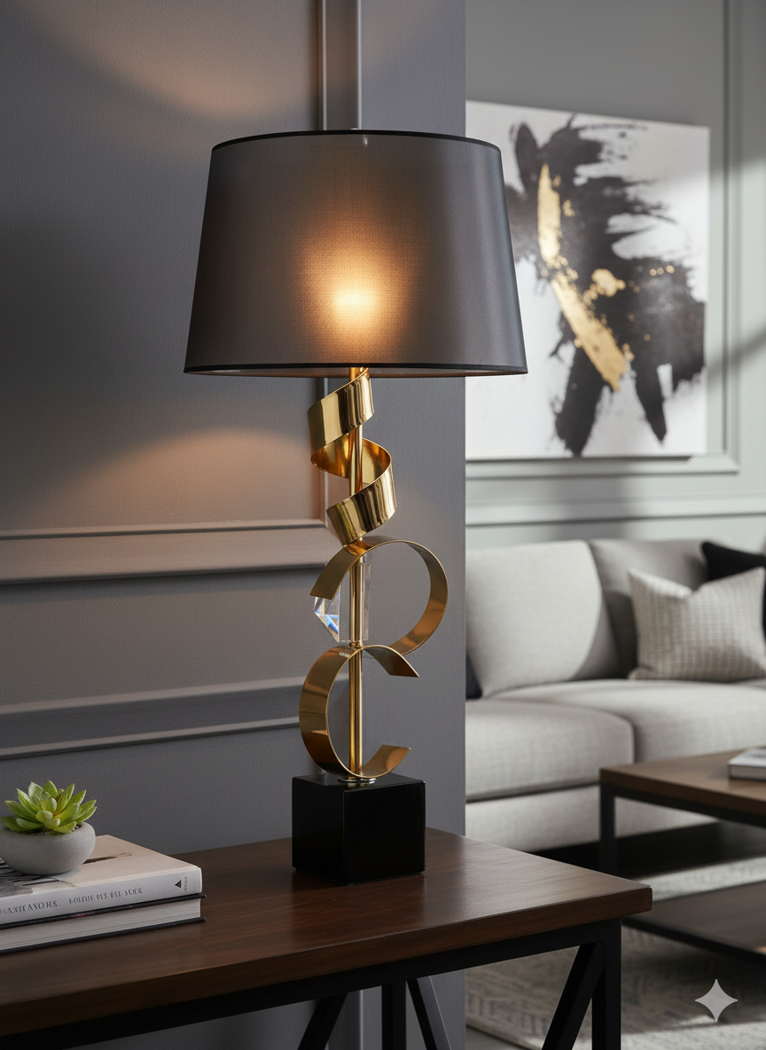 Artistic table lamp with a twisted gold ribbon sculpture base on a black marble plinth and a charcoal drum shade. A bold design statement for any interior.