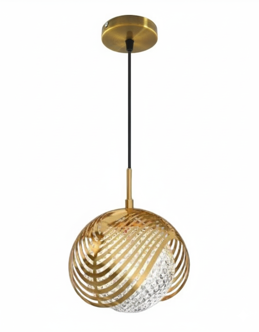 Eye-catching gold spiral-stripe globe pendant with dazzling crystal glass inner sphere. Adds glam to any contemporary or transitional space.
