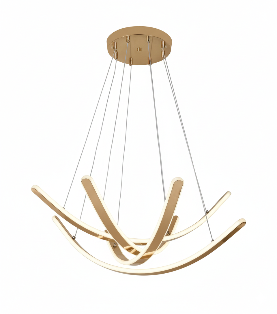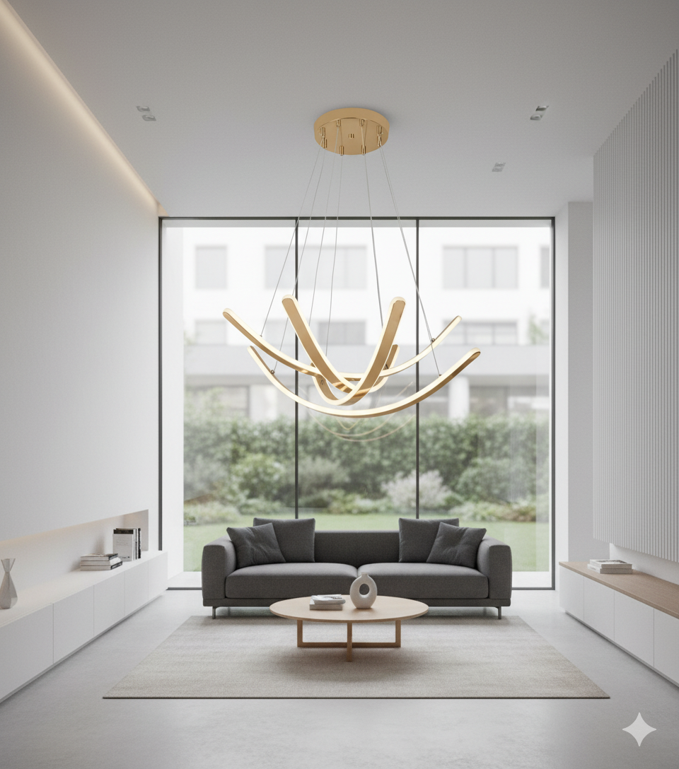 Dynamic starburst LED pendant with six upswept illuminated arms radiating from a central gold hub. Dramatic and modern for high-ceiling spaces.