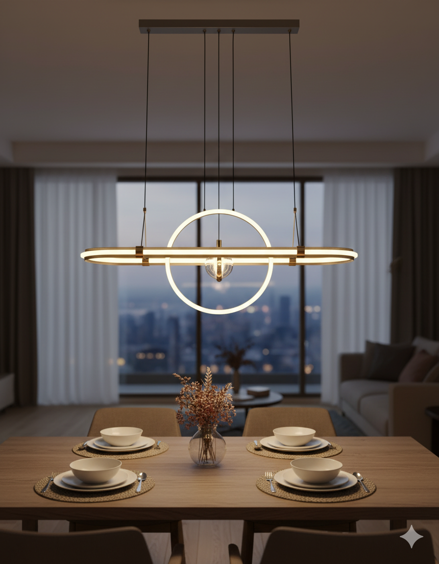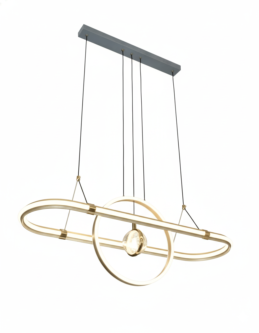 Architectural LED pendant featuring a horizontal oval bar intersected by a circular ring, with a central crystal orb. A striking conversation piece for modern interiors.