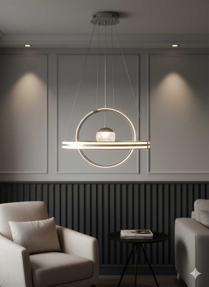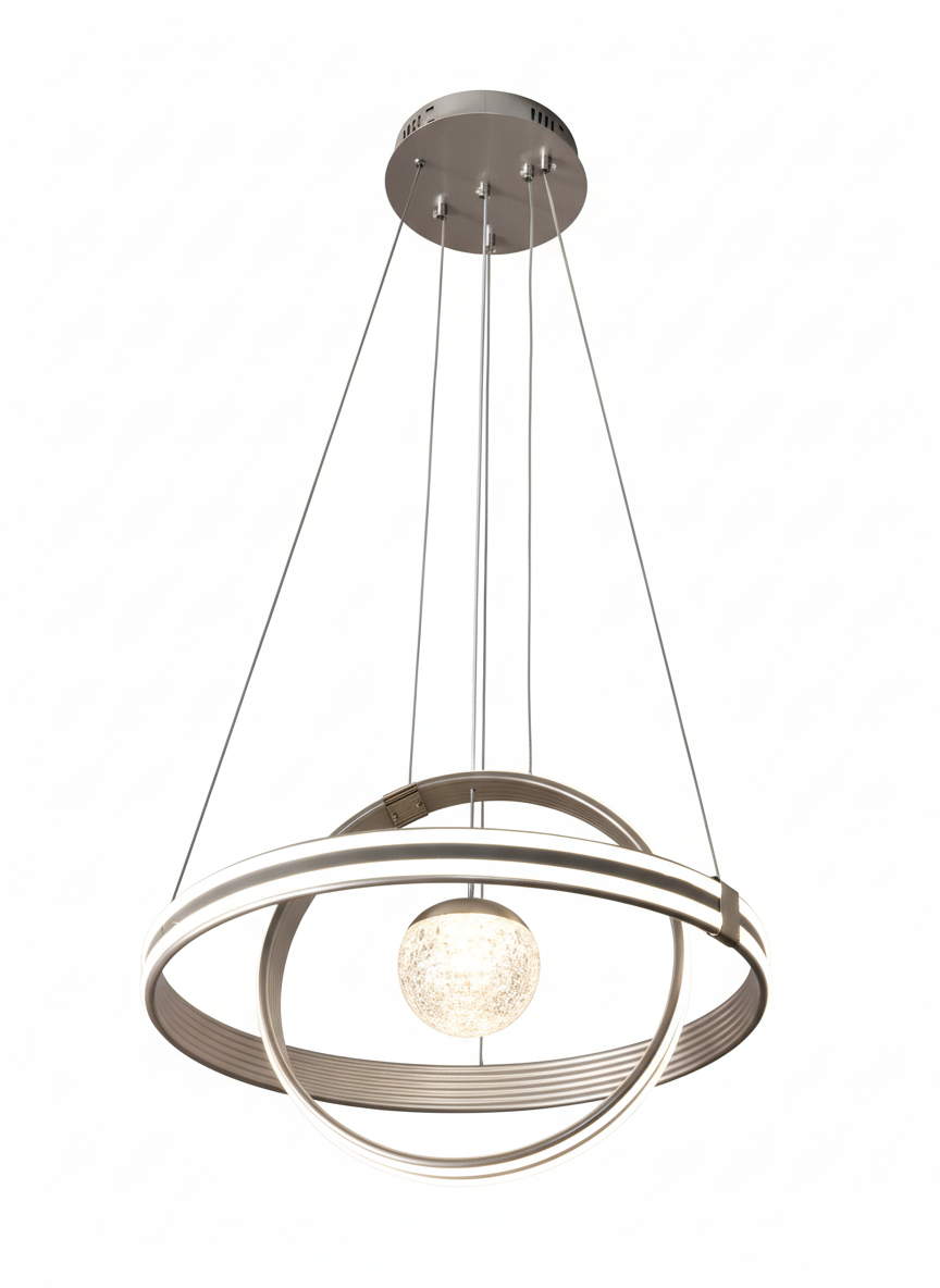 Striking silver LED pendant with intersecting ring and oval forms encircling a central crystal orb. Bold geometric design for modern and minimalist interiors.